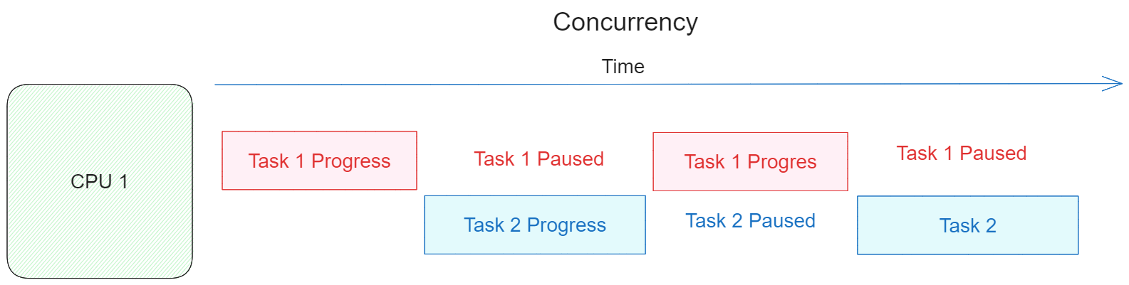 Pada dasarnya 1 CPU hanya bisa melakukan 1 pekerjaan dalam 1 waktu, sebagai contoh jika kita membuka banyak program sekaligus diperangkat yang memiliki 1 CPU, secara sederhana CPU tersebut akan berpindah-pindah (context switch) dengan cepat antara program 1 dengan program yang lain. hal ini menciptkan sebuah ilusi seolah-olah 1 CPU tersebut melakukan banyak pekerjaan secara sekaligus, padahal kenyataanya tidak. inilah yang disebut concurrency.